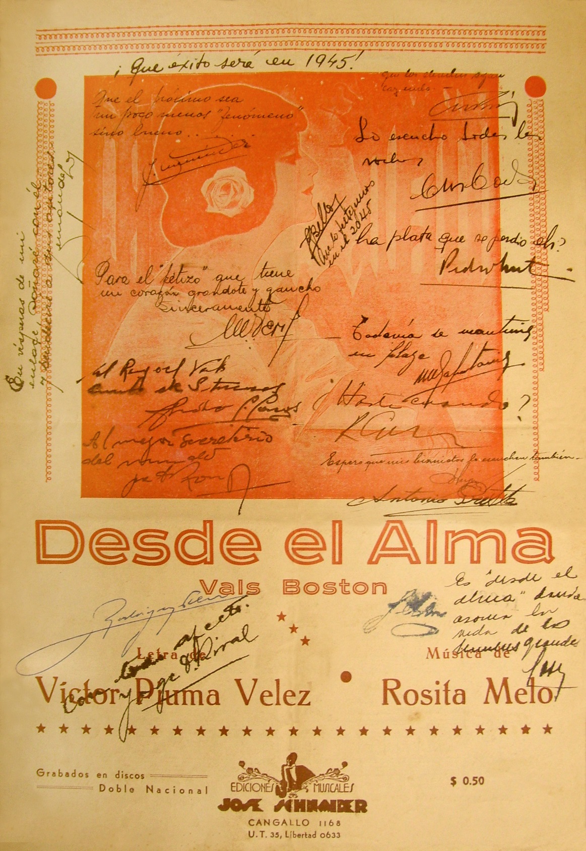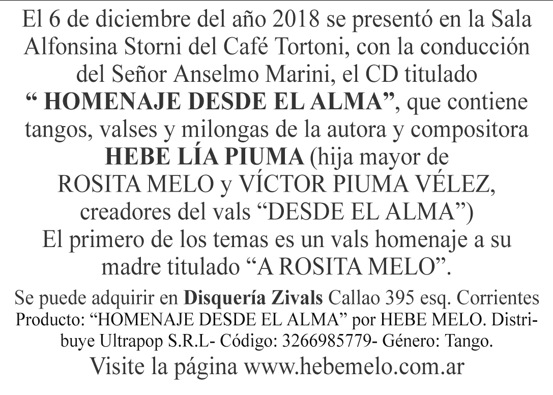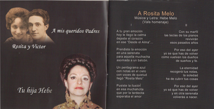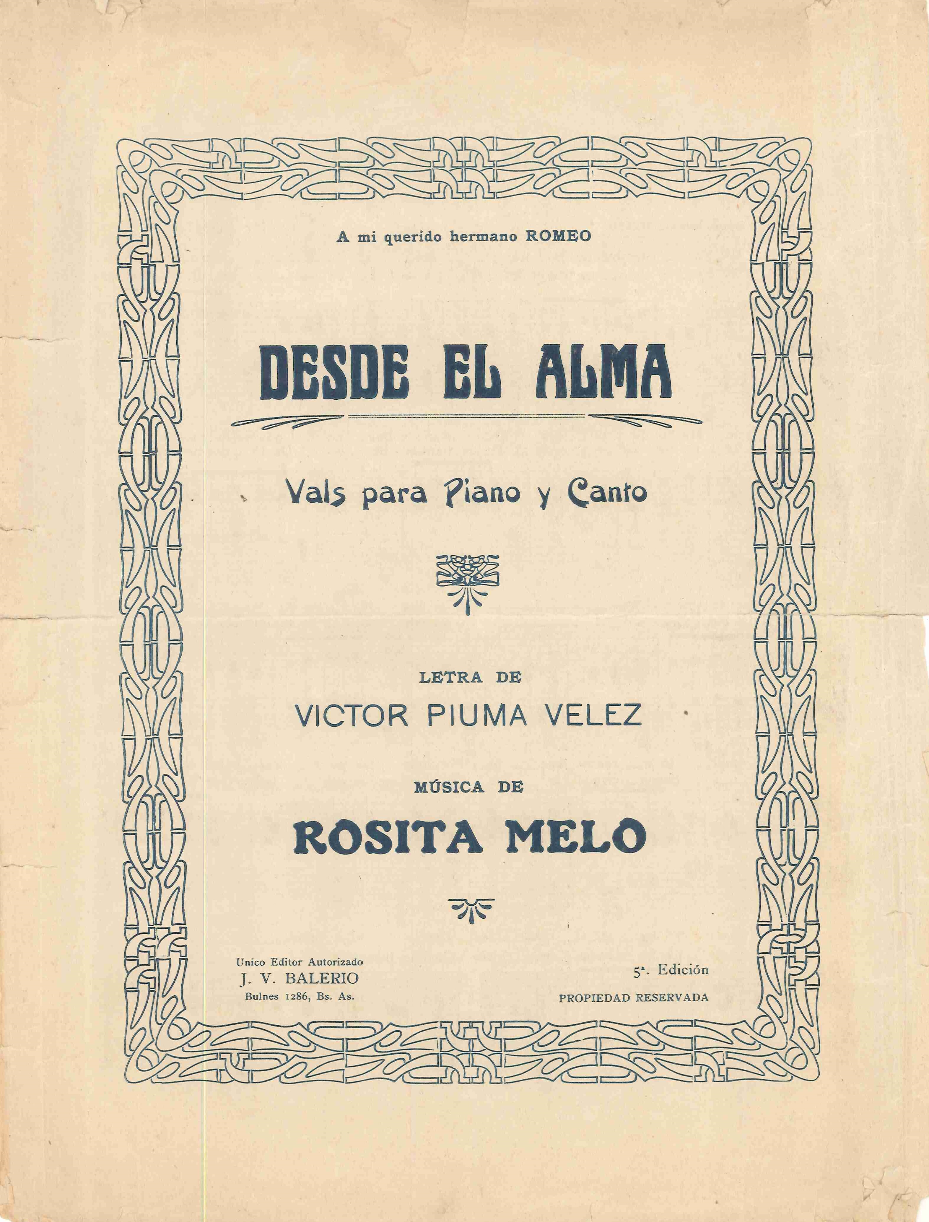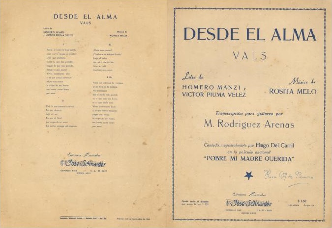 - DESDE EL ALMA (letra original del vals DESDE EL ALMA dedicada a la figura de la madre, del cual la música es de Rosita Melo y la letra de Víctor Piuma Vélez), década de 1920.Editado por la Editorial de Jose Schnaider. El mismo fue ejecutado por las orquestas más importantes de la época como la de Firpo, Fresedo, Canaro, Caldarella, Juan D'Arienzo, etc.
