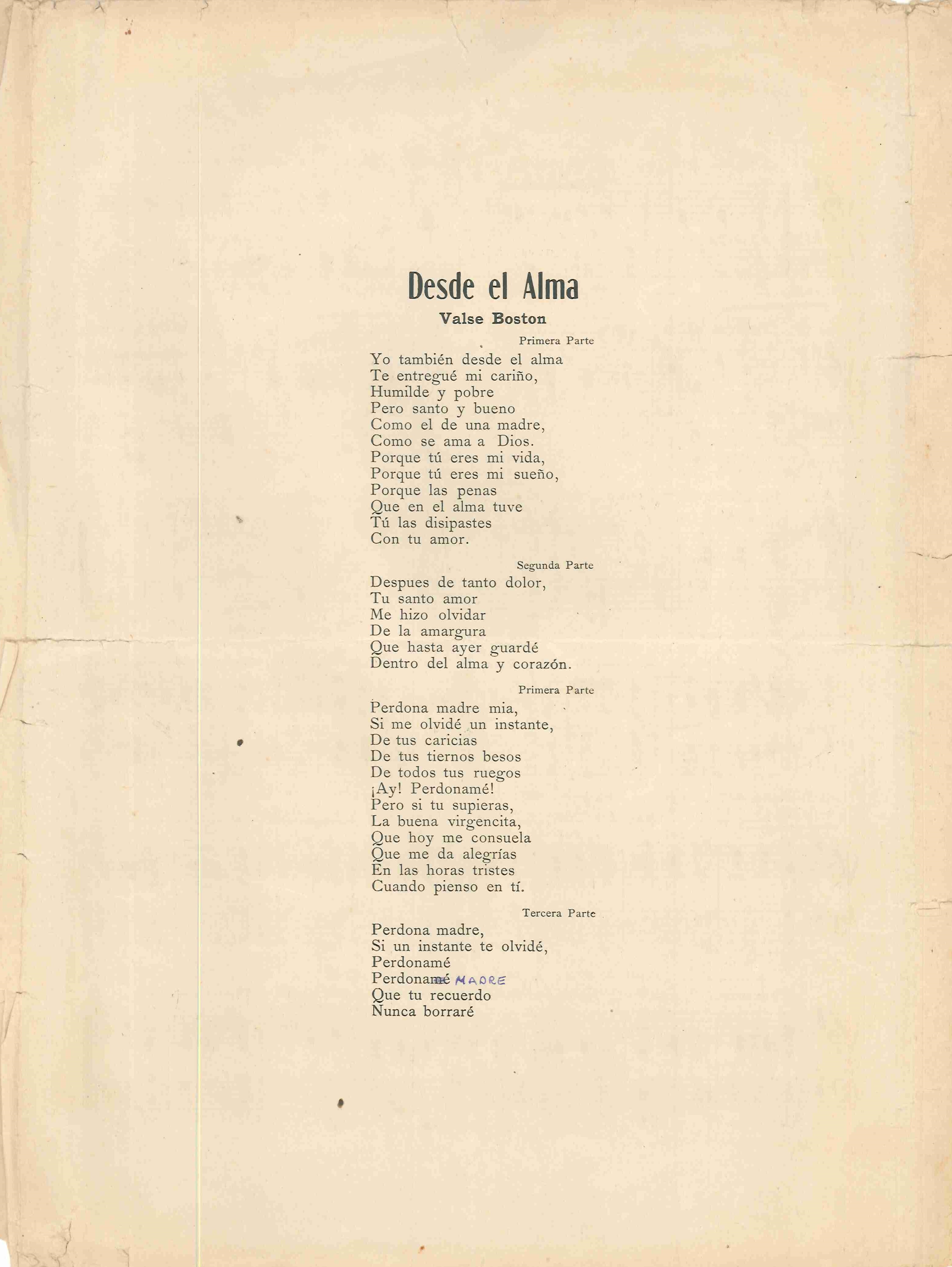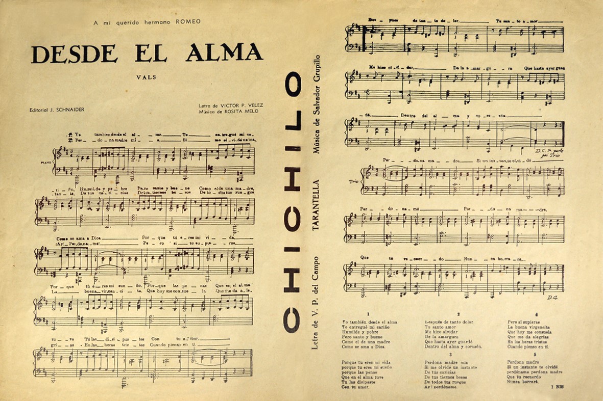 - DESDE EL ALMA, letra original del vals "Desde el alma", dedicada a la figura de la madre cuyo único autor es Víctor Piuma Vélez, año 1920. Música de ROSITA MELO - letra de VÍCTOR PIUMA VÉLEZ. Editorial JOSÉ SCHNAIDER.